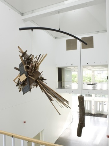 KC: I struggle with the decorative aspect, but Middlebrook’s titles really help, especially in How Much Thought and Consideration Goes into our Decisions (2008), with its metal armature, wooden plank, and cast concrete bottles. On one hand, he’s talking about resources, and on the other hand it’s more self-reflexive. From the Forest to the Mill to the Store to the Home and Back Again (2009-10) is a huge raw log balanced against discarded wood ranging from old floorboards to furniture and scraps collected from surrounding Chicago neighborhoods. The scrap wood radiates from a central point and is balanced perfectly with the log, precariously suspended in the atrium of the museum directly above viewers. Ascending to the upper levels of the museum, one can see just how gigantic the work really is.