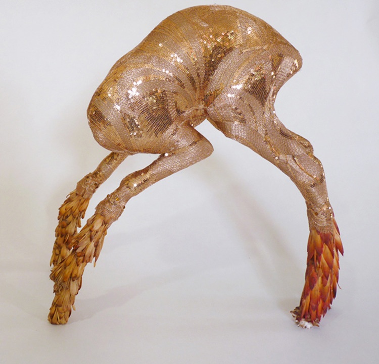 The most striking work is a set of anthropomorphic, almost life-size animal sculptures covered in upholstery, sequins, and other heavily wrought textures. Depicting wildlife such as bears and deer, the figures bow or stand in graceful gestures, and the contrast between form and texture is visually interesting enough to delay a visitor’s reaction, just long enough to be seduced by their elegant design. Only after a double take does the curve of a neck connected to a form on the ground give rise to a quiet kind of horror: the animals are horribly disfigured, leaning beautifully against the gallery floors because they lack front legs, and oversized barnacles or smooth fabric stumps appear where their heads should be. The most disturbing are sculptural hybrids, like a headless bear teetering on piano legs, and uncanny kinetic sculptures, like an automaton bird struggling endlessly in the mouth of a carved wooden cat.