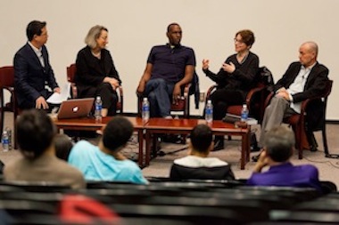 "Free Your Mind! Improvising Post-Multicultural Art" panelists; Stanford University, Stanford, CA, May 6, 2013. Pictured (l. to r.): Jeff Chang, Connie Wolf, Kori Newkirk, Elisabeth Sussman, and Daniel J. Martinez. Courtesy of Stanford University. Photo: John Chunhan Liau
