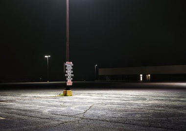 In a number of the photographs, the places depicted become both character and setting for the larger noir stories implied by the signs. In a piece titled Quiet Voices (Installed and Abandoned, Champaign, IL) (2012), an empty parking lot in front of a shuttered shopping mall is flooded with light from a single lamppost. On the lamppost is a sign that reads “When strange quiet voices are telling you something is wrong, you should listen.” The strange quiet voice could be coming from the lot itself, again warning of the dangers in the dark cement jungle. Or the sign could also be read as an epitaph for the businesses and bank accounts that were washed away since the start of the financial crisis in 2008. Next to the corpse that is the failed shopping center, the sign becomes a banner across a memento mori and a hard-earned lesson about hindsight and intuition.