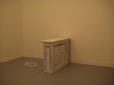Cameron Crawford’s installation in /blind /stand. (2009) artificially heats a small private gallery within the otherwise air-conditioned halls of the Art Center. Crawford’s warm room may have seemed like an unusual feat were it not for the curiously decorated twenty-eight-by-thirty-six-by-eight-inch white aluminum box with an extension cord streaming out of it that is placed against the room’s interior wall. It’s difficult to parse Crawford’s intentions here. Is the climate of the room meant to have an uncanny effect upon those experiencing it? If so, why make the heat source so conspicuous? Though I don’t know what is in the mystery box, I would hazard a guess that it is some sort of small appliance that uses electricity and generates heat. Adorned with prominent rivets and stylized radiation panels, the box itself is hardly interesting enough to command its position as the primary focal point within the installation. The obviousness of the piece could, perhaps, be interpreted as an ironic statement in which in /blind /stand. challenges the experiential promise of illusory art. But given the thesis of the show, this interpretation is likely to be unintentional.