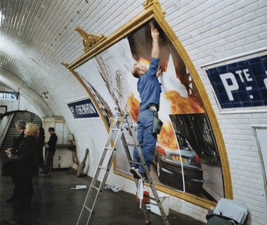 Sugar Water depicts a fictional metro station called Porte d’Erewhon, alluding to the title of the Samuel Butler novel Erewhon, which explores the hysteria of an imaginary society. A billposter works on a wall poster board surrounded by a decorative golden frame, and the process of pasting separate pieces on the wall slowly reveals the images of the series. During the 72-minute film, a viewer is confronted with images depicting a car bomb explosion photographed a couple of seconds apart. While the billposter works, groups of people walk onto the platform, wait, and then board trains, barely paying attention to the drama unfolding on the wall.