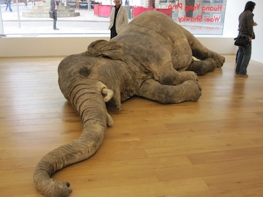 In the installation Marché de Punya (The Market of Merits and Virtues) an elephant lies dead in front of a typical street shop market stall selling traditional Chinese carvings and banal household items—this symbol of wisdom and strength is overtaken by excessive economic expansion and forces of globalization, the plasticization of the western world defeating a power of nature.