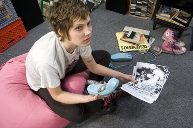 Unlike Araki’s doomed teenage apocalypse, From Portland With Love is particularly sweet and even hopeful. Each work is rife with analog and obsolete media—the overhead projector, rotary phones, and turntables—and, thus, a patina of nostalgia complicates the relationship between cultural production and resistant identity construction. While the works are sometimes irreverent in tone, they remain academic in spirit, each operating decidedly and politely within the given limits of the chosen media, as well as within the arena of official “art.” There’s an adolescent aura that’s employed not in an angsty, “Fuck you, Dad!” way, but a dancing-in-your-bedroom-mirror-core kind of way. While From Portland With Love can be said to address the complexity of identity formation in relation to the larger production of culture, each work only topically invokes a DIY spirit, serving only to illustrate, rather than enact, a relationship with resistance. The show reinforces the idea that these types of subcultures are, in actuality, a performance of resistance—a cultural script that names the culture and the subsequent positing of an opposition. Nevertheless, by taking this cultural script as a space of possibility, From Portland with Love could be a fun, engaging, and optimistically refreshing show. The works, executed with conviction, manage to sidestep slipping into a vapid wasteland of either the youth-driven consumer culture or the fruitlessly nostalgic.