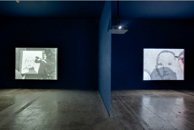 The Dissolve, installation view, SITE Santa Fe, 2010. Left: Edison Manufacturing Company. The Enchanted Drawing, 1900; 35mm film transferred to DVD; 1 minute 26 seconds. Producer: J. Stuart Blackton; Camera: Albert E. Smith. The Library of Congress, Paper Print Collection, Washington, DC. Courtesy of the Artists and Site Santa Fe. Right: Oscar Muñoz. Re/trato, 2003; video; 28 minutes. Courtesy of the Artist and Sicardi Gallery, Houston, TX.