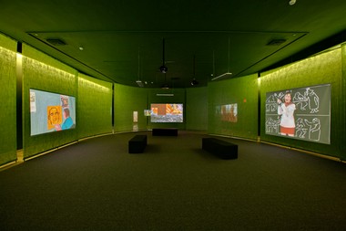 The simultaneously projected films in the Cinerama are hard to watch, but the discrete sound systems attached to each piece help to anchor the work in the physical space of the site, ultimately showcasing the strongest pieces. Ezra Johnson’s wonderful What Vision Burns (2006) combines collage with stop-motion animation of his paintings about an art heist. Laleh Khorramian‘s mysterious Water Panics in the Sea (2010), taken from her series about the five elements, makes use of multiple media: monotypes, collages, and stop-action animation techniques.In Maria Lassnig's surprising and humorous work, Maria Lassnig Kantate (1992), the artist places herself into an environment made up of her own drawings and paintings.