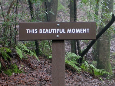 But who couldn’t use a bit of refreshing bodywork? O'Malley takes advantage of the site’s landscape with A Healing Walk, a full-fledged hike that makes the show something one can spend a reasonable amount of time with (and offers added value if one makes the schlep down from San Francisco or the East Bay). The piece winds through existing trails on Montalvo’s wooded hillsides, making a vigorous walk (brightly colored walking sticks to aid the journey can be borrowed from the gallery). Along the way, the artist has installed wooden national-park-style signs that punctuate the journey to a final lookout point, with phrases that create a loose, Burma-Shave-like narrative of visual and psychological awareness. Does it generate happiness? Perhaps, though rooted in the body, the endorphins that are released post-hike suggest some kind of physiological condition as much as a mental one. As one surveys the nearby estates, Silicon Valley’s sprawl, and San Jose’s downtown, one might be tempted to pull out a more omnipresent happy-making device and take a picture. It could make the positive vibes last longer.
