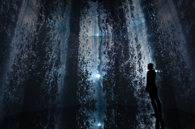 Inferno consists of an octagonal interior space made of tall rectangular screens with a mirrored floor and ceiling. Projectors are positioned on the outside, showing synchronized footage of a high-contrast, extreme close-up of water droplets cascading in a dark space. The sound element is a long rumbling crescendo, a processed chorus of wordless human voice that is cinematic, reverberating, and grandiose.