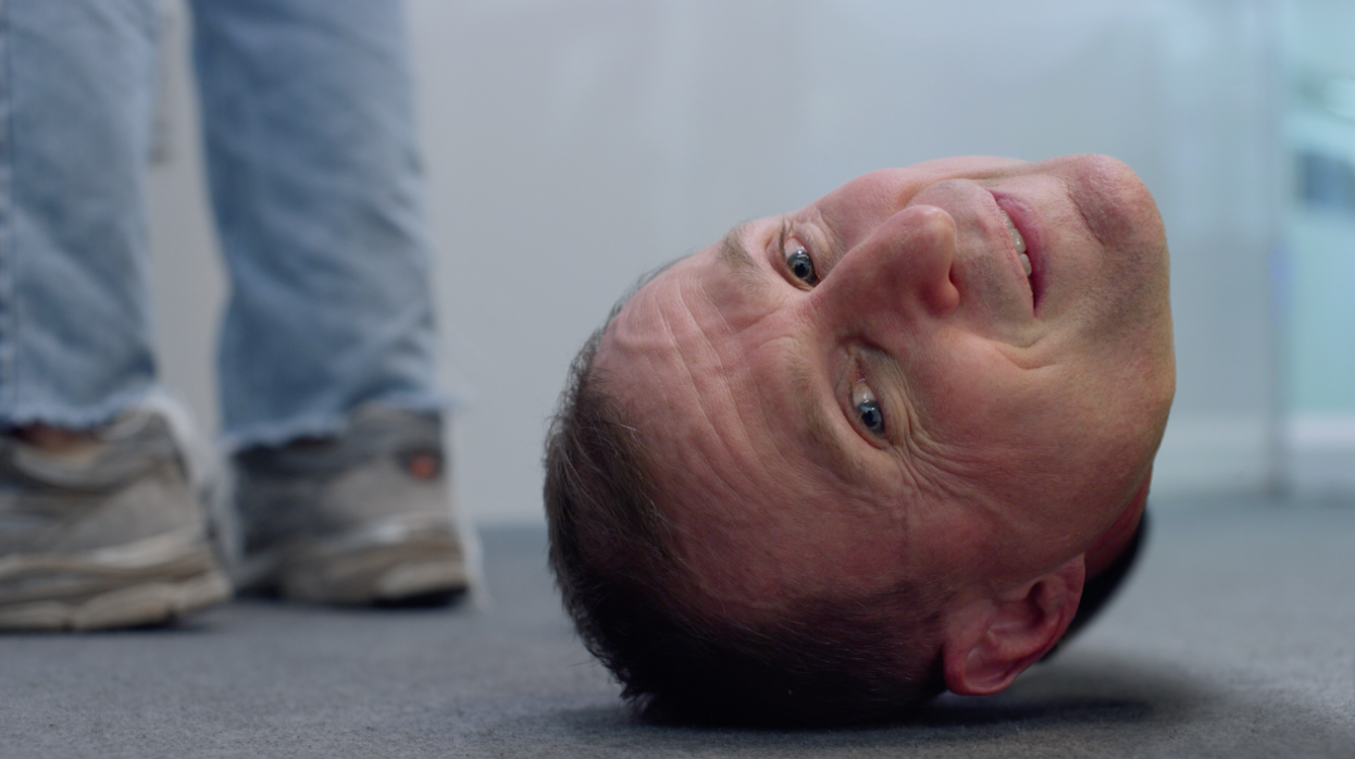 Now, these are no ordinary instructors. They vary from a disembodied head speaking about contemporary aesthetic theory and elucidating the difference between the zany, the interesting, and the cute—as defined by Sianne Ngai, in contrast to the classical categories of the beautiful and the sublime—to a vaguely fishlike, reptilian interlocutor who narrates our descent into and out of The Restaurant, a streamlined glass skyscraper nestled in a strange mountainous region out of place, time, history, and, in fact, nowhere at all except for right here.