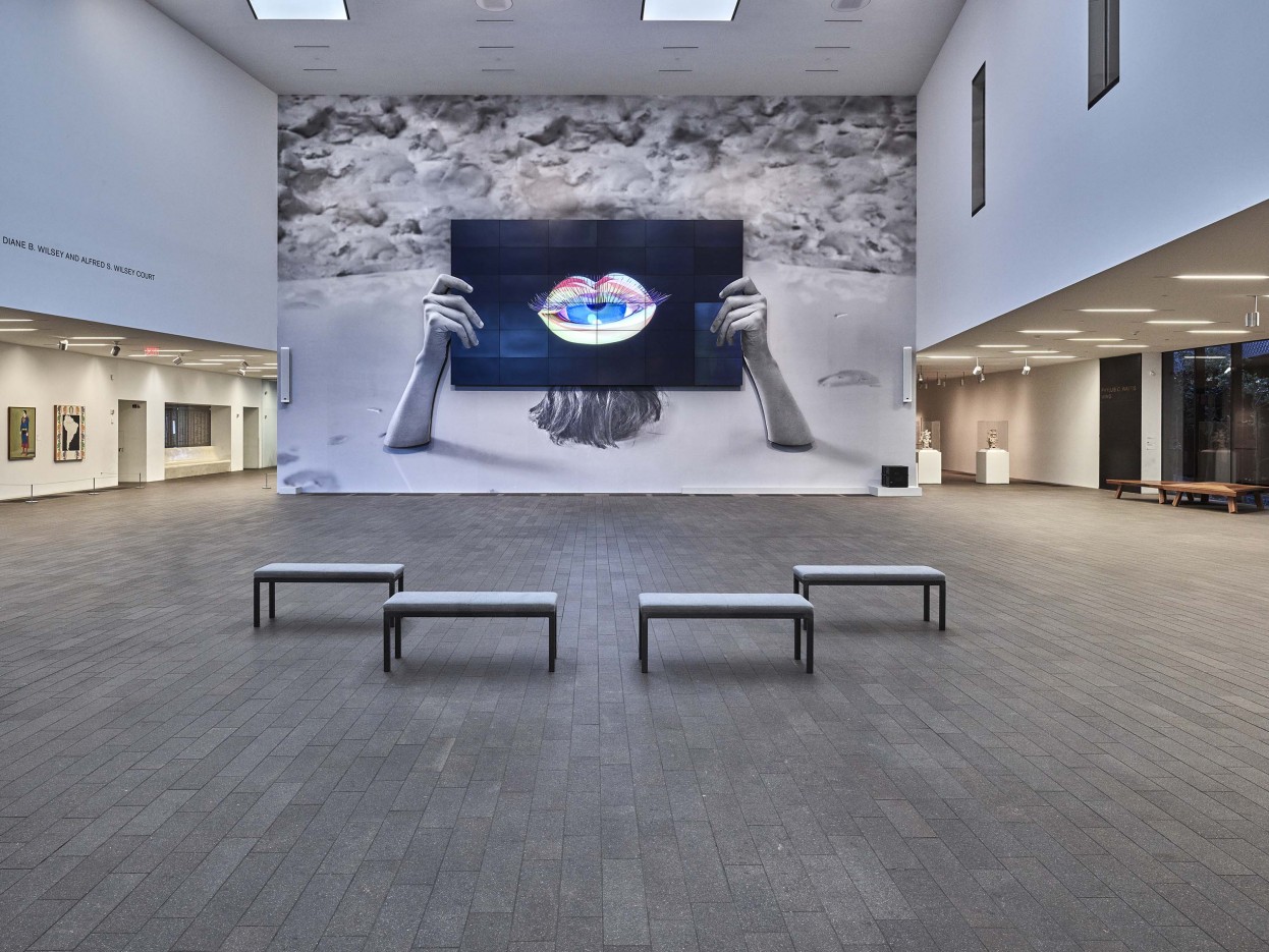 As a platform for creativity, DIS features contributors including artists and curators who are immersed in commenting and presenting on myriad topics: fashion, art, music, culture.1 In the de Young’s atrium, the installation strikes as broadly entertaining, hitting upon the spectacular and the oversized. An avatar host welcomes you; its body is a moving eyeball, eyelashes and all, that is embedded within a luscious and juicy pair of pink lips.2 The host literally and figuratively speaks to viewers of the future-forward while offering commentary interspersed with video content including a nature show on human–animal relations in Africa and Thailand by Korakrit Arunanondchai, a video focusing on “general intellects” with McKenzie Wark, and a docu-short on economic utopias by Christopher Kulendran Thomas, among several other conjectures. In addition to the eyeball and mouth, a three-dimensional pair of black-and-white arms extends out into space, holding up thirty-six flat-screen displays whereby your spectacular instructors shall appear.
