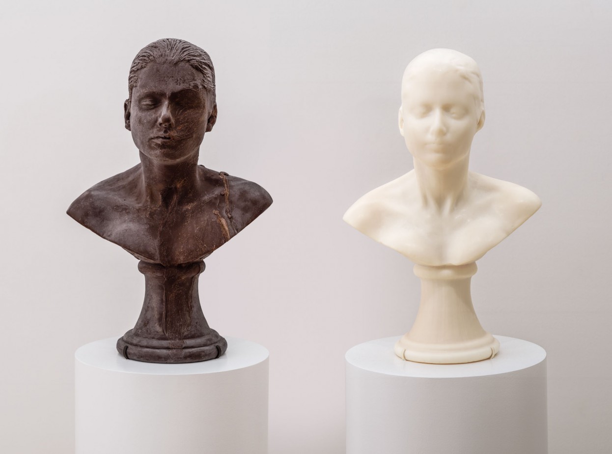 Janine Antoni, Lick and Lather, 1993-1994; two self-portrait busts: one chocolate and one soap. Collection of Carla Emil and Rich Silverstein and San Francisco Museum of Modern Art. © Janine Antoni.