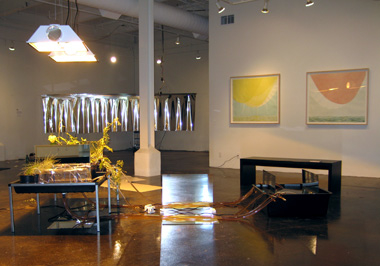 "Groundswell," installation view, Kala Gallery.  Front: Elliot Anderson, Non-Site: Alamitos Creek, 2010; mixed-media installation. Back: sonicSense: Barney Haynes and Jennifer Parker, solarSonic, 2010; new media installation. On wall: Emily Payne, Basin, 2008; gouache on paper. Courtesy of the Artists and Kala Gallery, Berkeley.