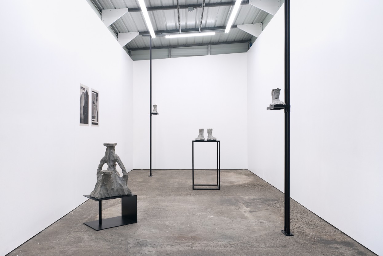 In the exhibition, two powder-coated black steel struts are held between the gallery’s ceiling and floor. To the uninitiated, they might have always been there. A shelf bearing a lumpy, gray concrete object is attached to each strut. Cast from assorted flea-market discards, these objects resemble oversized hybrids of hands and feet. They are simultaneously gruesome and alluring: fingers are fused together to form a bridge of a foot, and large thumbs protrude from heels. One could imagine these appendages teetering through the gallery on stilts, precariously navigating their surroundings.