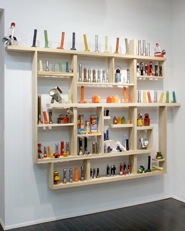 When Flaneur and Collector Meet for the Second Time (2010), a wood shelving unit displays the artist’s collection of flashlights, interspersed with colored wax casts of the same flashlights. The piece investigates the way collecting imparts objects with a secondary layer of meaning. The wax casts are further removed from the flashlights’ original function and thus imbued with a yet another layer of meaning, which casts doubt on the nature of their authenticity. The title is perhaps a reference to one of Gustave Courbet’s most well-known paintings The Meeting, or “Bonjour, Monsieur Courbet” (1854), which portrays a meeting between the vagabond artist and his collector, Alfred Bruyas. Both works draw our attention to the changing identities objects take on after they enter into a network of commerce.