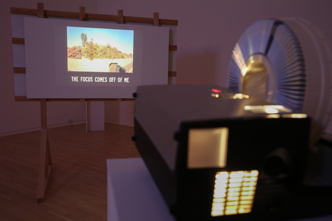 Now decommissioned, US 66 was one of the first highways conceptualized as an experience, rather than simply a carrier to one. Many things now regarded as canonical to America—fast food, oddities shops, billboards, and neon signs—began along this highway. DinéYazhi´ utilizes these vernacular visual forms of roadside culture throughout the exhibition. Incorporating six collections of digital photos converted to 35mm projector slides and adding text overlays, the artist orients the historical memory of US 66 away from the canon of American nostalgia, and toward the Diné bikeyah people. The work’s name, Galéé Sin, is a reference to a journey song for protection. It is “a song of survivance,” DinéYazhi´ stated in an exhibition talk, “in which the land and Indigenous bodies are healed from enduring traumas and freed from the confining bounds imposed by the colonizing settlers’ imagination and regulation.” The rapidity of the changing projector slides mimics the accelerated way the scenery whizzes by through the window of a moving car.