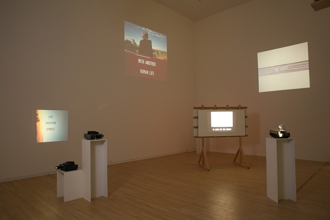 While billboards are structures for public advertisements, DinéYazhi´ proposes a more personalized and non-commercial, and even cathartic, use for this communication system. The piece Hey Jolene (2016–2018) is a 50-slide poem projected on a makeshift billboard, dedicated to their late friend Jolene. One slide reads, “Hey Jolene where you going with that gun in your hand / clenching it like it was medicine & replacing it with a fifth of whiskey.” Another slide reads, “You blacked out so you forgot to remember to be kind to yourself.” The words are frank but not reprimanding, and compassionately acknowledge that drinking relates to family, which relates to history. The words read like an elegy, to Jolene, and to others who have lived through the countless ways in which generations of trauma and violence can ricochet throughout a land, throughout a life.