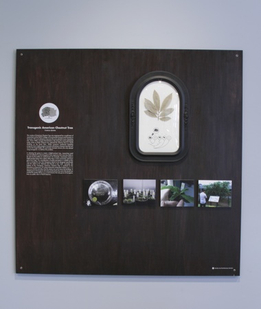 Center for PostNatural History. Transgenic American Chestnut Tree Display, 2012; chestnut specimen, photographs. Courtesy of the Artist and Southern Exposure, San Francisco.