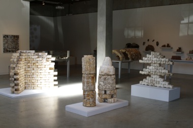 Finally, on view are many examples of San Francisco’s longtime innovator Philip Ross’s work with fungi. These seem to most closely align with the stated intention of the curator to demonstrate research exploring new ideas in science and art. Pure Culture Series (1996–), for example, which Ross has been developing for more than fifteen years, features cloned versions of the Ganoderma fungus. Through the artist’s intervention, these have been formed into evocative shapes and colors—reminiscent in some cases of Voulkos-like ceramics, in others of cheese wheels, and still others of tree branches, deliberately grown to resemble Harold Edgerton’s famous photograph of a drop of milk. Ross discovered that by exposing the fungus to low levels of oxygen and high levels of carbon dioxide, the resulting stress would cause these unusual shapes to develop. His second body of work, Mycotecture Series (2006-), proposes these same Ganoderma growths for potential building blocks: a cheap, clean, and efficient replacement for wood and Styrofoam. Ross in fact has a patent pending for this idea. In the gallery, he shares some constructions made up of these brick-like mushroom products.