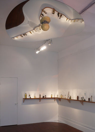 Jars Filmed Inside, 1980–2010; installation view. Background: Jars Filmed Inside, 1980–2010, overhead: detail of Buoy, 2010. Courtesy of the Artist and Triple Base Gallery, San Francisco.