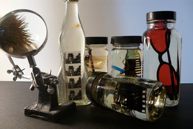 In her first solo show at Triple Base Gallery, longtime San Francisco visual artist Elaine Buckholtz presents a personal Wunderkammer. With Hunter Longe—whose installation "Perception Projection Delay" (2010) makes a beautiful concurrent exhibit in the basement—she lines the gallery walls with a mirror-topped, ruler-edged shelf on which she displays optical devices and the eponymous mixed-media series, "Jars Filmed Inside" (1980–2010).