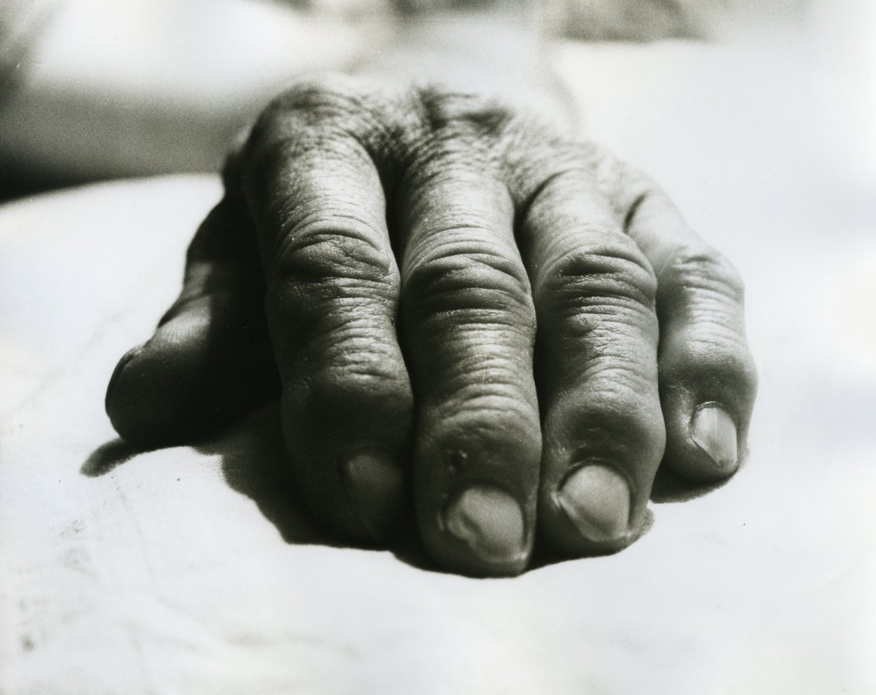 More than a third of the works included are gelatin silver prints. The still lives may seem obtusely simple at first—a piece of driftwood in the sand, a slack hand lying atop a bedsheet, a close-up of a leafy potted plant specked with dew. In DeFeo’s renderings, however, the intense play of light and shadow cuts the pictorial field with a pallor and darkness so intense that innocuous things become eerily deathly. Otherwise-imperceptible details emerge: the decay of the driftwood, liver spots creeping up the hand, insect damage to the seemingly lush potted plant. In photographing each still life from two perspectives, DeFeo creates a startling dimensionality that makes them, in pairs, even more unsettling. The same hand in an untitled 1973 work that seems lifeless and slack in profile becomes threatening when seen head-on in its companion print, the shadow under the bent fingers suggesting an encroaching movement toward the camera lens.1