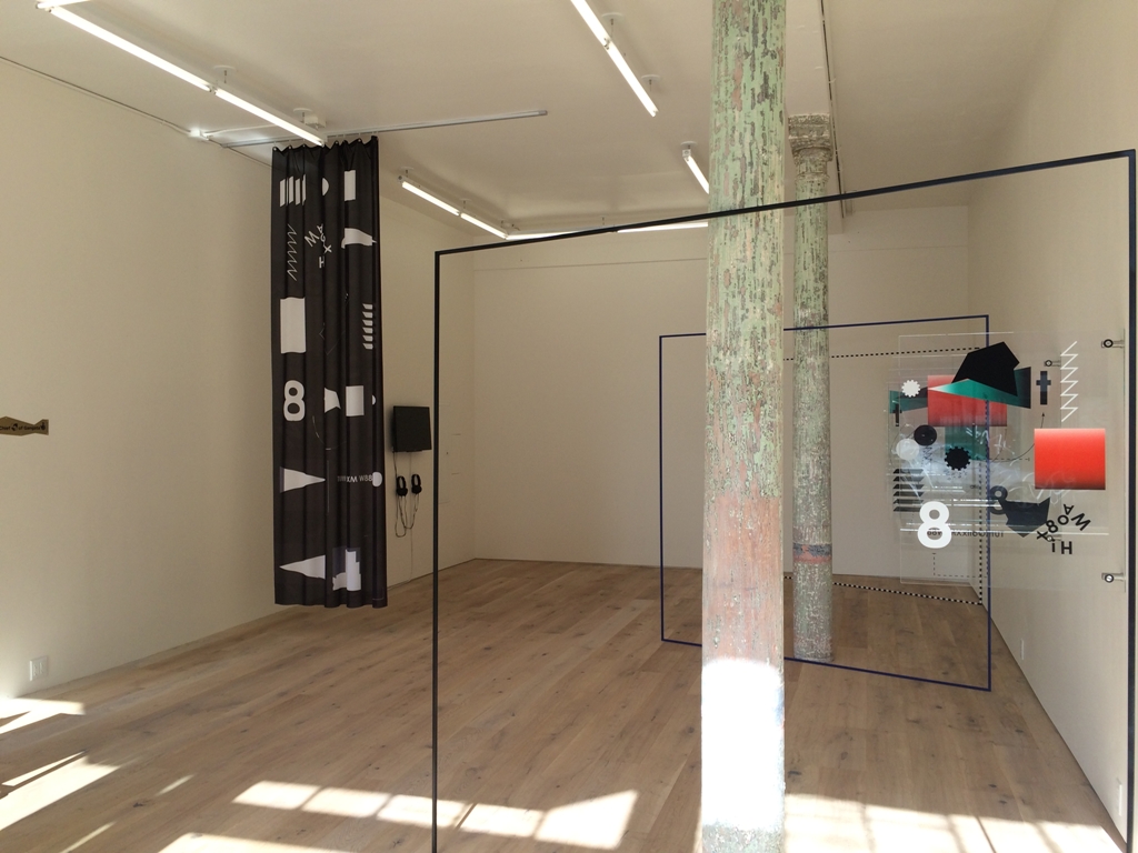 Cerrillo’s installation is composed of three square metal structures that naturally interlock with the original pillars of the gallery, and is paired with six glass panels, each printed with colored geometric shapes and symbols. On the opposite side, a black-and-white curtain patterned with symbols separates the space. The installation highlights the transparency of the glass and the minimalist nature of the metal forms, and complements the gallery’s design and use of natural light brought into the space through large windows. Cerrillo’s installation invites the audience to physically interact with the work, and moves away from traditional, front-viewing interactions. As a result, the audience can navigate freely between works in an open space to discover the multiple perspectives and reflections produced by the glass and this mode of installation.