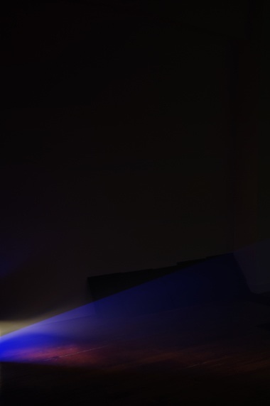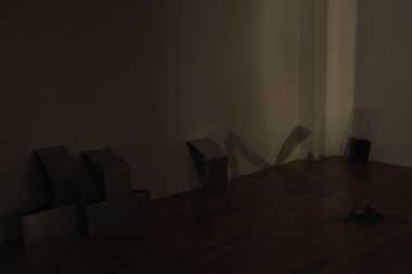 The few bright lights that pierce the darkness cast dramatic shadows as viewers move about the space. From one side, they illuminate; from another, they obscure. Whereas light normally illuminates individual works in a gallery, here it is part of the work. Viewers are forced to navigate around scraps of steel and glass with little visual aid and risk stepping on the several works lying on the ground. The fog machine heightens this disorientation, producing a diaphanous mist that captures the light and creates an opaque blue mass in the center of the room. Walking through the exhibition, I was reminded of Minimalist artist Tony Smith’s infamous nighttime car ride on an unfinished section of highway, which made him aware of the importance of experience over purely retinal sensation. Speaking to the experience, he said, “I thought to myself, it ought to be clear that’s the end of art. Most paintings look pretty pictorial after that. There is no way you can frame it, you just have to experience it.”1