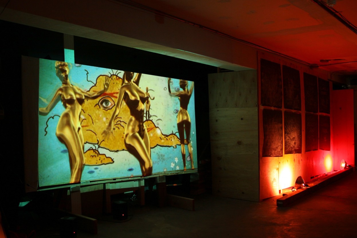 August 29 - August 31, 2014 Solo ShowRelieved to be in the physical world, away from a computer screen, I travel on a Friday evening to a quiet residential street in Bernal Heights and duck under a black tarp into a narrow, low-ceilinged garage. For a short while, I’m alone with the work: a tight display of video, sculpture, and drawings. To my left, a cement crawlspace is cast in the glow of red disco lights. To my right, a plywood ramp is draped in strips of gold foil, proclaiming itself “THE TOMB OF THE APHALACEPHALE.” Ahead, looped projections and a grid of drawings line the garage walls.