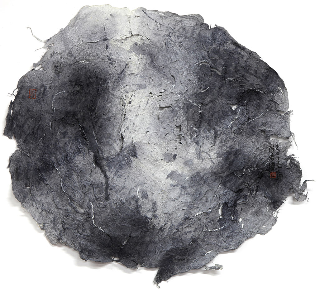 Some of Lu’s most successful works are painted over textured paper. In Lotus Pond 2012 No. 049 (2015), the wrinkled surface and uneven borders suggest ripples on a pond while the soft washes and muted tones create an impressionistic, dreamlike mood. The light source at the center of the composition suggests the perspective of a viewer peering up from the bottom of a well. This point of view may sound ominous, but Lu’s gentle modulations in tone create a landscape that is peaceful and inviting. His balance of form and void creates a sense of spaciousness. The overall effect gives the viewer the sense that she can breathe underwater in a space that is still, calm, and separate from the outside world.