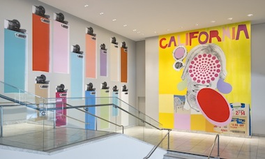 The humor and optimism is evident as soon as one enters the Hammer Museum’s lobby. On the wall above the staircase are Meg Cranston’s frenetic floor-to-ceiling collages California and Fireplace 12, garishly announcing themselves. She borrows images from consumer culture, rendering forms in bright colors with a playful cut-and-paste aesthetic.