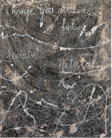 The front room contains a suite of panels set against opposing walls and the large-scale work Long Distance Runner (2010). “Change your attitude but remain natural,” implores Naked Simplicity (2010). Flakes of silver leaf crust off the surface of this small panel, and an aggressively worked net of marks underneath these cursive letters gives the effect of a sandstorm viewed too closely. The processes employed here are mysterious, but carefully and painstakingly rendered, burnished down by the artist’s hand or tools. The paintings use scribbles, crumples, calligraphic smears, and subtle topographies, and it is the viewing of these paintings and their palimpsests that creates the most harmonic moments in the show.