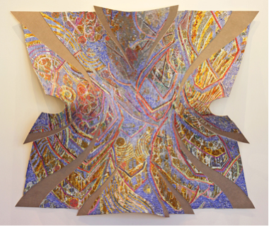 In contrast, the back hallway is cast in seductively low lighting, and subtly sculptural paper works splattered with saffron paint are flashier than those in the front room. Despite the change in ambience, there is still a sense of clashing—meditation, calmness, and collections of thought arise against the more turbulent and intensely wrought materials. The low relief and collage topographies are reminiscent of Nicola López’s impossible cities and systems, collapsing and spiraling into themselves. Pieces of paper that jut off the canvases’ surfaces, thick coats of paint, and dozens of punched and layered holes make these pieces more overworked than the front room’s meditation suite. Some quietly stand out in muted tones, but Spatial Palace for Enemies, Organic Poster, and Storm the Gate of Confusion (2009‑10) are not served well by their scattered and chaotic picture planes, especially given the forcefulness of Excellent Athlete (2010), a huge stapled mess that curls gorgeously off the opposing wall, perfectly controlled and out of control all at once.