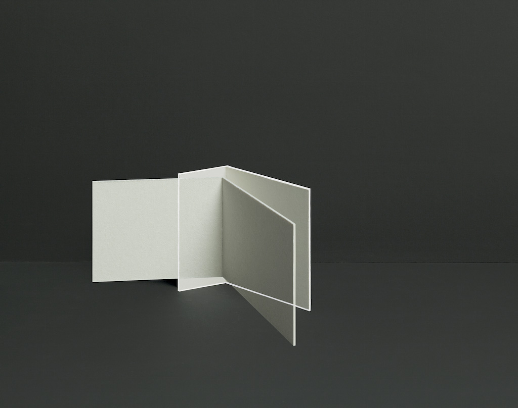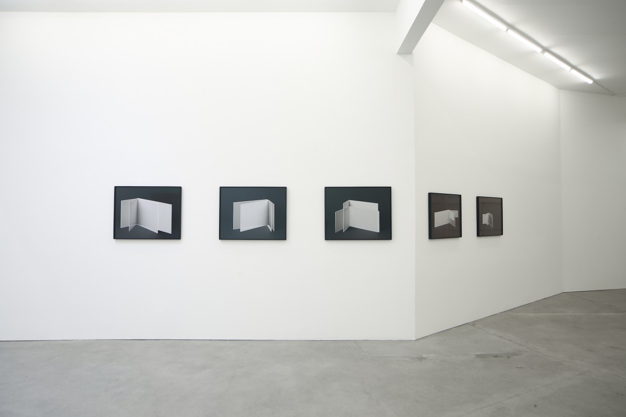 As in her earlier works, for At On Böhm repeatedly re-photographed arrangements of simple materials, layering multiple exposures to create the finished work. The result is a surreal dimensionality, with lines and planes that intersect in unusual ways, suggesting a simultaneous depth and flatness that refuses to resolve neatly into one or the other. She is reticent to describe the specifics of her process, but we do know that Böhm sometimes draws or paints on the photographs during the early stages of a work in order to emphasize a particular line or angle jutting out of the picture plane. Equally III (2015), for example, is a deceptively simple photograph of two folded pieces of white board against a black background. The boards appear to intersect at their creased edges, with the plane of one protruding outward toward the viewer. Closer examination, however, reveals that the edges of the boards are highlighted in white paint. This draws attention to certain impossibilities in the intersections and layers; one plane “ought” to be receding behind the other, and yet it isn’t. In Böhm’s photograph, shadows and lines don’t reconcile into a conclusive depth of perspective or point of view.