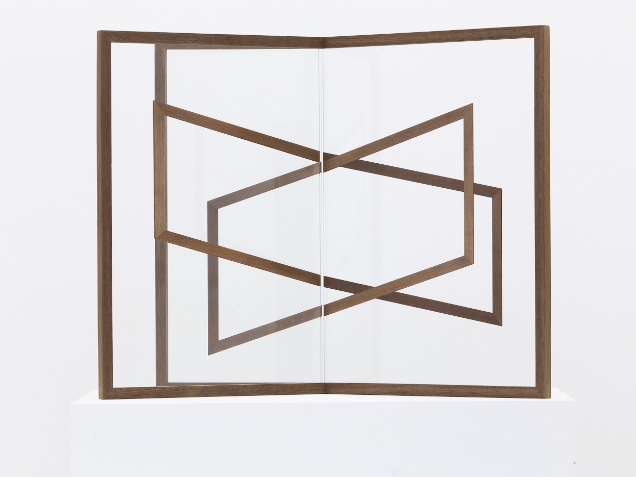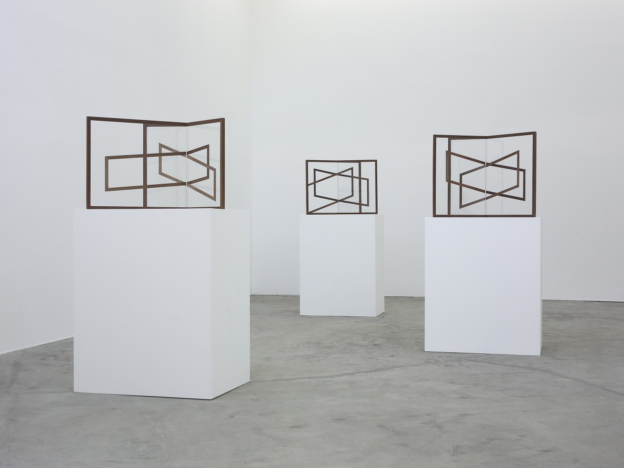 The artist’s first foray into sculpture—the series Mutual (2015)—occupies the rear portion of the main gallery. With pedestals painted white to match the gallery walls, the sculptures appear to hover in midair when viewed from the entrance in the slanting afternoon light. Atop each pedestal perches an object composed of intersecting glass planes framed in dark walnut; photographs of wood grain printed on vinyl are adhered to the surface of the glass. Unlike Dibbets, who looked to photography as a means to eschew the multiple viewing angles demanded by sculpture, Böhm embraces the changing perspectival experience created when one moves around her objects. In Mutual I (2015), the printed vinyl strips form a pair of rhombuses positioned at perpendicular angles across the glass panels. Because the glass panes are clear and we can see through one form to the other—and also because the walnut frame holding the panels matches that of the printed vinyl—the result is a layering of lines that, when viewed head-on, appears flat and two-dimensional, like a drawing. As one moves around the work, however, the rhombuses shape-shift as the angles of intersection change.