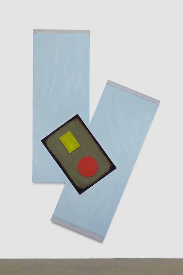 Rappaport’s roughly seven-foot paintings feature shaped canvases on which rectilinear forms intersect with and overlap each other. The works have intensely saturated layers with loosely brushed washes or, occasionally, heavy slathering of paint and medium. Stick-like pieces of painted wood appear in some, adding elements of line to the composition. Light washes of sky and aqua blues produce fields of shimmering color and a sense of ephemerality or movement, a possible nod to Richard Diebenkorn’s Ocean Park series (1967–1988) with his wash-like compartmentalization of color. In contrast, the thicker impasto areas of blacks, brick reds, and vegetal greens immediately ground some paintings, laying claim to the wall. In Dogleg (2015) these techniques play off one another, fighting for space in a canvas that looks like two elongated rectangles colliding. These shaped canvases rely on the gallery wall as a compositional element of the work in a way that recalls the late Ellsworth Kelly’s shaped paintings. Both artists’ works become almost graphic elements of the total architecture of the gallery.