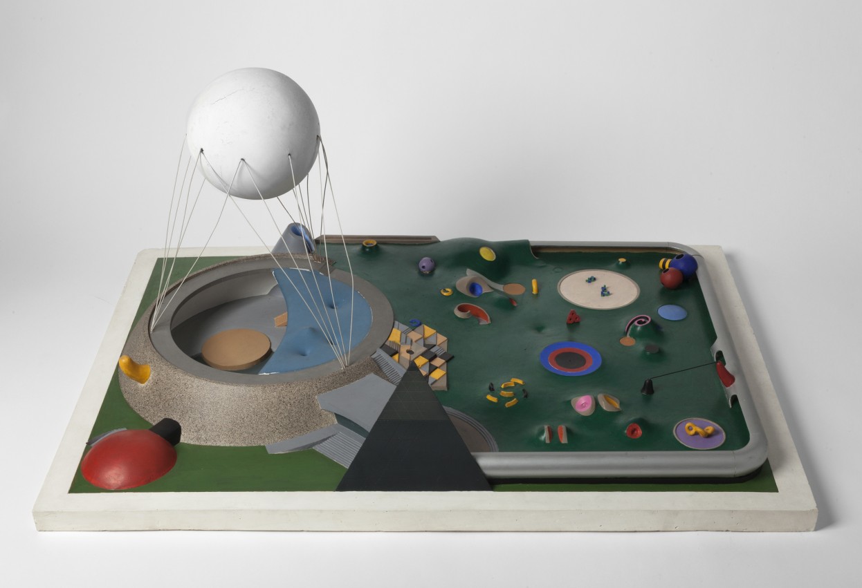 Originally conceived as a playground model for Central Park, Noguchi’s Model for Contoured Playground (1941, bronze-cast in 1964) looks more like a skate park than a playground. The tabletop-size model is in the shape of an amorphous circle. At one end is a hill with a slide carved into its side, and at the other is a contoured basin. Smaller curves, hills, and slides emerge from the landscape within and around the perimeter; it is reminiscent of Charles Jencks’s Landform (2001). Noguchi’s playground could be considered a precursor to Land Art. The artist’s model indicates the use of land as his material to design the playground, leaving no distinction between play sets and the land itself.