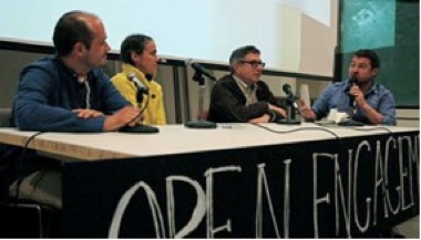 Open Engagement featured presenters (from left to right): Nils Norman, Amy Franceschini, and Mark Dion at the closing panel. The panel was moderated by Nato Thompson (far right). Courtesy of Open Engagement Facebook Group.