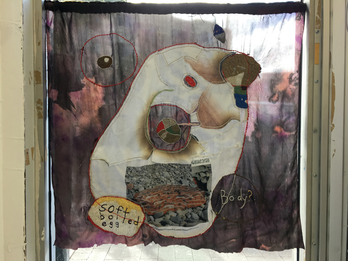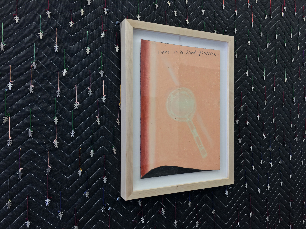 Traces of corporeal actions are encountered again in Ritter’s Venn Diagram of Subjects Who Don’t Belong in a Venn Diagram (2010–2018), a rectangular textile piece that hangs, back-lit, against a street-facing window. Here, a patchwork chick is embroidered on translucent, tie-dyed silk, hovering over two ovum-shaped text bubbles; the left reads “soft boiled egg” and the right says “body?”. As passersby on the street move behind the work’s semi-sheer surface, thus disrupting its querying image, shadows from an ambiguous crowd fill in for the missing body implied in the text—now multiple in form. Ideas around the collective body are expanded upon in Ritter’s There is No Fixed Position (on Protection Blanket) (2017–2018). Here, a generic, blue-black moving blanket is stretched taut and secured vertically to the wall, displaying a surface embellished with hundreds of tiny, silver “pigtail girl”1 charms dangling on multicolored strings. Hanging in the blanket’s upper-middle, a framed drawing depicts a yellow magnifying glass below the hand-written text, “There is no fixed position.” Empowered by this phrase, I imagined the blanket freed from the wall, shaken out, wrapped around a valuable object, or neatly folded. I considered what it would be like to use the magnifying glass to closely inspect the charms in variable positions. Notions around vantage point, privilege, and gendered hierarchies came to mind, inspired by the inherent properties and uses of the work’s found-textile form.
