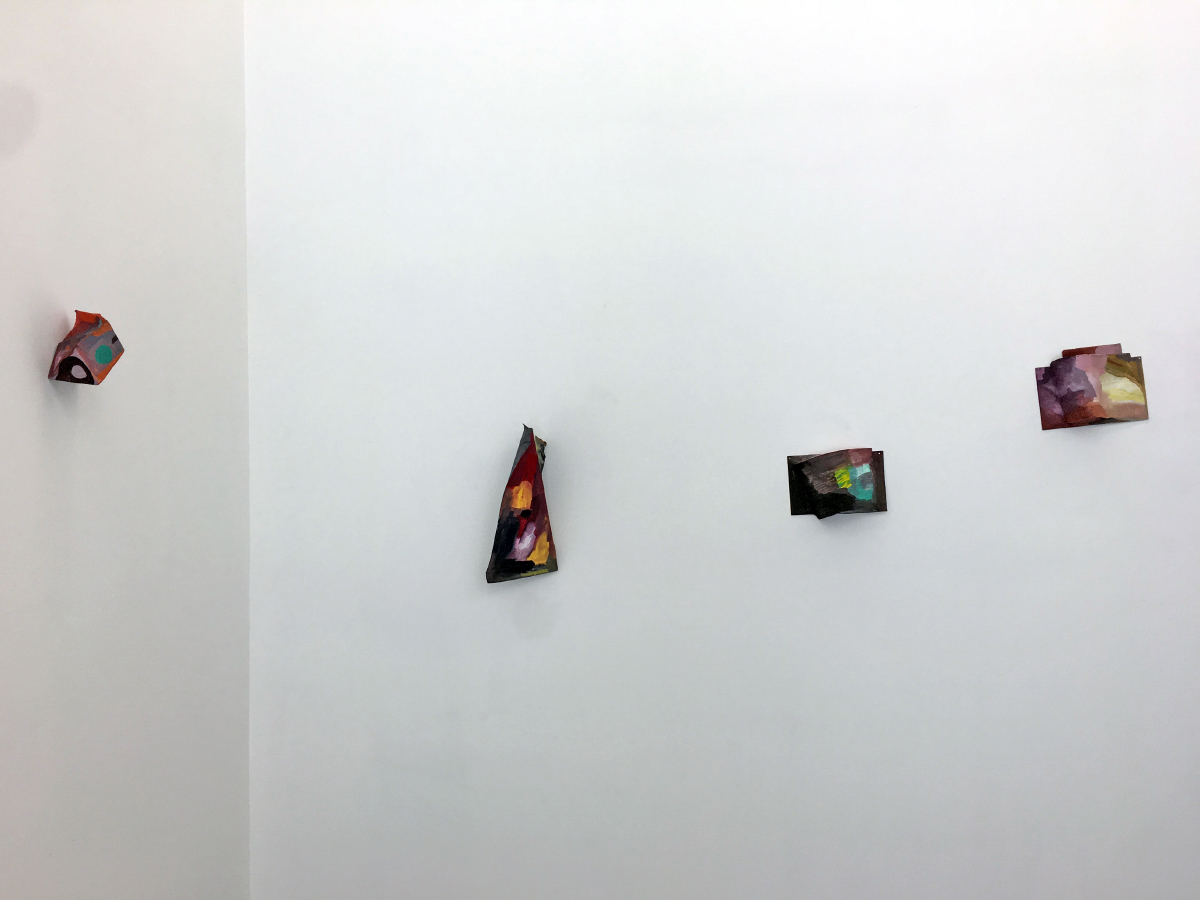 To the right of Mirror and Slippers, at about knee-level, Dana Dart-McLean’s Light House with Opposing Leaves (2018) is reminiscent of a flattened moving box that has not yet been fully deconstructed. Jutting from the wall at a 90-degree angle, its almost-two-dimensional form and abrupt orientation direct attention to another series by the artist across the room. Self Portrait/Landscapes (2018) is a grouping of wall-hung sculptures made from papier-mâché that appears to have been folded and unfolded repeatedly, and then molded into precarious shapes. The resulting physical traces of these actions appear naturally integrated into the papier-mâché’s brightly painted patterned surfaces. Although displayed at varying heights within the range of “eye level,” the work’s tactility begs instead to be felt by palms or fingers. The work’s materiality is in dialog with viewers’ own bodies here, a reminder of how processes and exchanges shared with certain objects or materials can be articulated by memories stored in one’s hands.