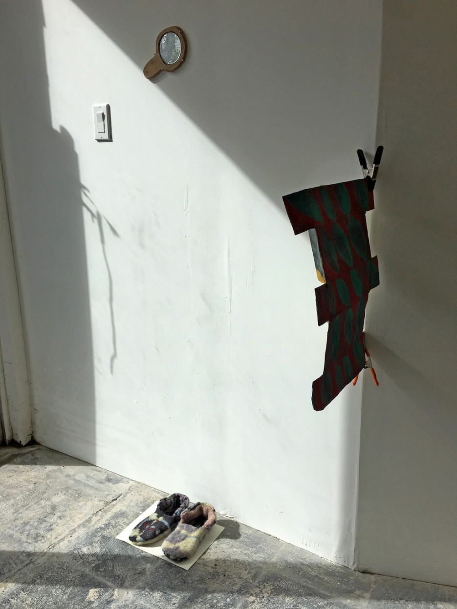 Opening a Can, installation view, Et al. etc. Johanna Jackson. Mirror, 2018; ceramic, mirror; 5.5 x 6.5 x 0.5 inches. Dana Dart-McLean. Light House with Opposing Leaves, 2018; papier-mâché, gouache, cardboard, clamps; 24 x 16 x 3.5 inches. Johanna Jackson. Slippers, 2018; felt; 9.5 x 9.5 x 3 inches. Courtesy of the Artists and Et al. etc. Photo: Sienna Freeman.