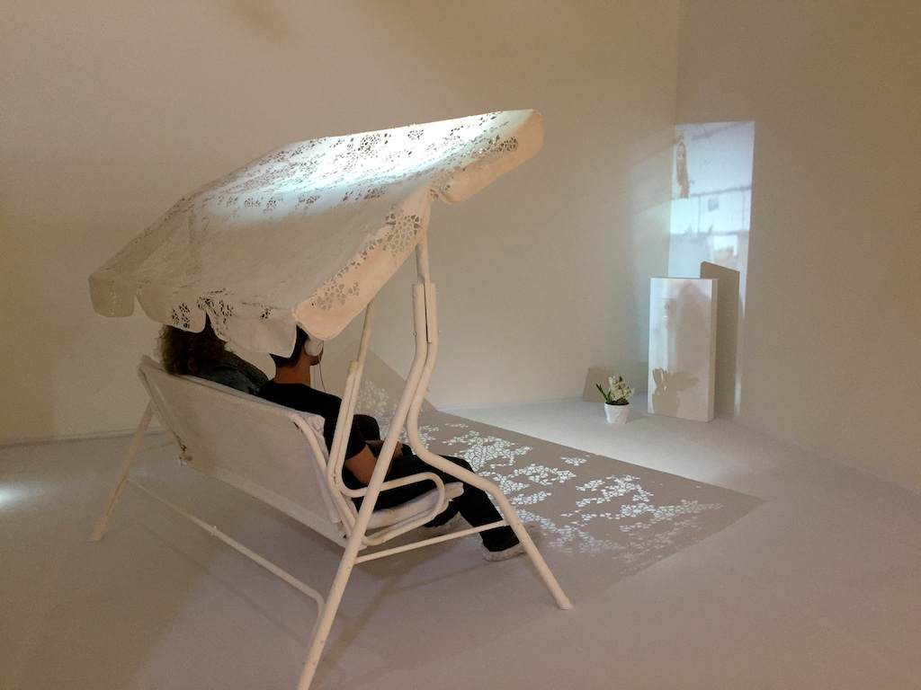 By contrast, in Cyrous’s work the central protagonist is the viewer’s body. In The Closest I Could Get to the Sun (2017), she enforces a synthetic environment by requiring the viewer to wear shoe coverings in order to keep the white vinyl floor as pristine as possible. The piece brings forth a provocative approach to the physical aspect of interactivity. After I put on the provided shoe coverings and headphones, I sat in the installation watching and listening to the specific, intimate narrative of the Iranian landscape. The following phrase stayed with me: “The sky opened to hold me in its arms.” Despite the artificiality of the tungsten sun rays—which beam down onto the floor and wall, creating an intricate pattern of shadows that cut into the awning of a swing set—the work indeed manages to lure viewers into an emotional and poignant space. This space is no less enigmatic and brings to the fore more questions than answers: How well does technology actually enable us to connect and get closer to the things we are unable to be present for and touch? The projections, at some point, cease to exist when the viewer turns to see the light source responsible for adorning the white floor and walls. Yet, for a few moments, we are brought into a space where the pale white surrounding, which borders on antiseptic, is warmed and activated by the human body.