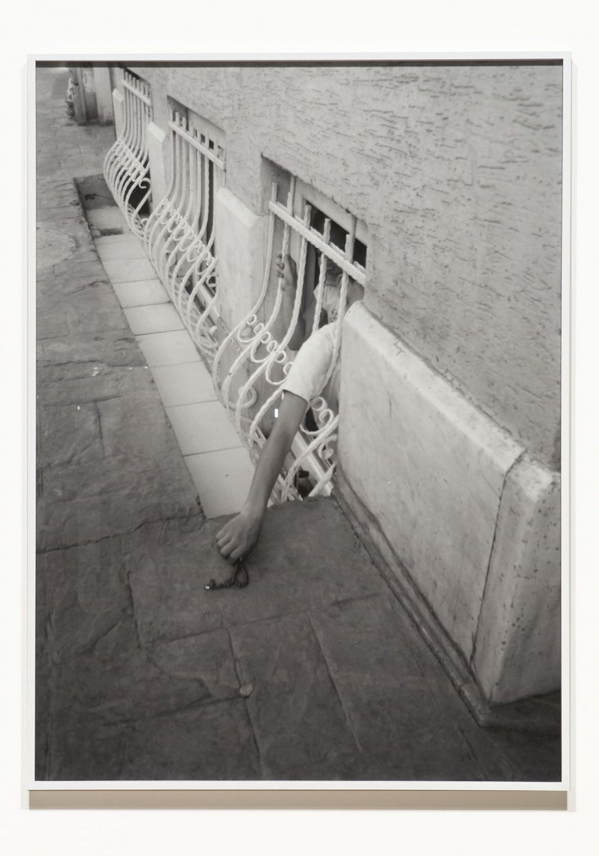 In the work Sleeping statue (2013), an image of a pair of disembodied feminine hands are overlaid on the head of a slumbering monkey who seems unaware of their comforting or menacing presence. Untitled (permaklik) (2014) shows an arm reaching through a basement-level security grill to either retrieve or offer a strand of prayer beads. In Dangling (2011), a human figure walks hunched over, either weighed down by their own hands or playing at a peculiar sort of evolutionary regression. And, while there are no real hands in Untitled (Arm auf Teppich) (2015), a crudely constructed approximation of an arm lies inert on an Asian carpet like a dropped murder weapon or a remnant of a child’s game.