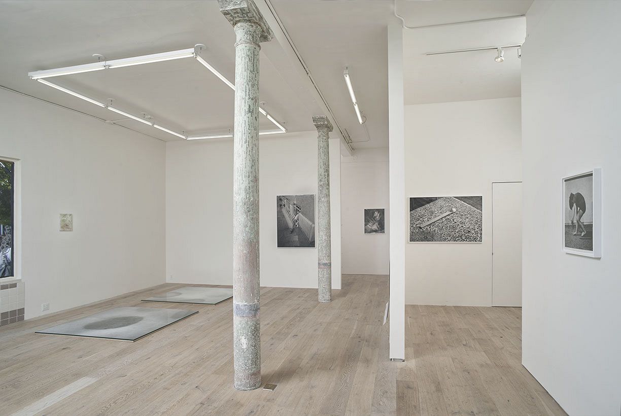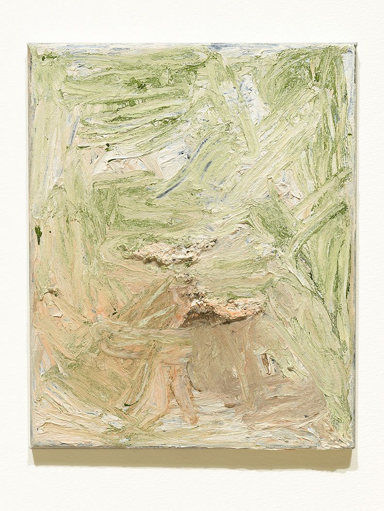 Altin’s seemingly small exhibition cannot be seen from a single vantage point, and exists wholly only as a memory. Like all memories, its boundaries are soft, allowing influences from the space around to seep in. The pale-green-edged brushstrokes in the painting Trauma look uncannily like the paint-scraped surfaces of the gallery’s two tall wooden columns, and it is unclear if the work, which was finished this year, was intentionally made to echo them or if this coincidence is a carefully orchestrated accident. Similarly, in Echo (2013), the hands of a hunched figure grip at a head that they seek to either comfort or punish. The piece sits on the floor propped against a low tile wall beneath the gallery’s light-flooded front windows, with an acid-etched remnant of graffiti dripping down toward it from above. The creeping marks make the huddled figure in the work seem at risk of being dripped on, adding a newly protective reading to the grasping hands.