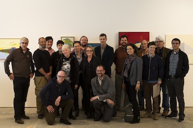 "Painting Expanded" symposium speakers, organizers, faculty, and guests; California College of the Arts, San Francisco, April 13, 2013. Pictured (l. to r.)—kneeling: Tom LaDuke and Keith Mayerson. Standing, front row: Mary Heilman, Linda Geary, Amy Bessone, Keltie Ferris, and Bruno Fazzolari. Standing, second row: Joe McHenry, Meleko Mokgosi, Lecia Dole-Recio, and Mary Weatherford. Standing, back row: Jordan Kantor, James Gobel, Vincent Fecteau, Dushko Petrovich, Robert Faggen, and John Zurier. Courtesy of California College of the Arts, San Francisco. Photo: Cole Hansen.