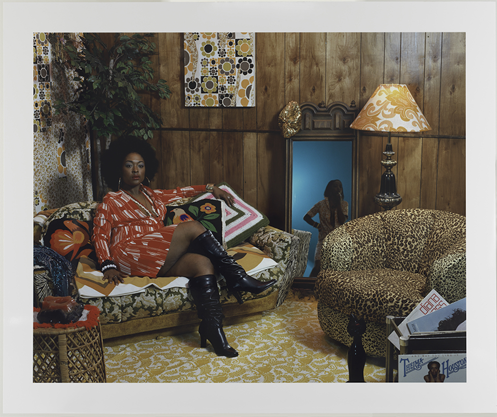 In photographic prints like Sista Sista Lady Blue (2007), Mickalene Thomas features strong black women styled in an Afro-chic aesthetic indebted to 1970s Blaxploitation film heroines like Pam Grier and Tamara Dobson. Amid retro living-room sets, these women lounge comfortably on couches in poses that immediately recall odalisque models of 19th-century erotic painting. Thomas, however, empowers her models by depicting them with a cool confidence; their direct gaze and self-assured stance reaffirm their place as active subjects within the frame.