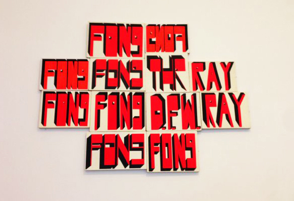 Kota Ezawa shows Self-Portrait as Someone Else (2013), a video based on a recording of a renowned Asian economist, also named Kota Ezawa, being interviewed about financial markets. Ezawa uses the original soundtrack, but with his own signature cut-paper animation. One of the Bay Area’s most subtle and evocative artists, Ezawa suggests the fragility of identity, and extends the conventions of self-portraiture to near breaking point. Similarly, Barry McGee, who like Ezawa is of mixed cultural descent, shows Untitled (2012), a wall-mounted set of two dozen DayGlo-orange wooden boxes, most with the name Fong—his mother’s maiden name—printed boldly, forward and backward, along with Western first names, three-letter acronyms, and one image: a drawing of a blank white book. Onto the pages of this empty book viewers may project the assumptions, prejudices, and preoccupations we carry about race, heritage, and the lives our neighbors live.