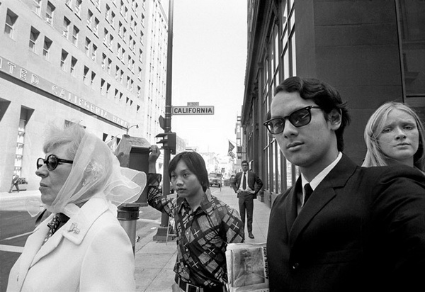 In one image in the gallery, Self-Portrait (1973), four pedestrians stand on the corner of San Francisco’s Sansome Street, captured under a street sign that reads in bold, capital letters: CALIFORNIA. Two are Asian men, two are white women; all look off in different directions and all are seen from the waist up. This is one of nine black-and-white prints from a suite of photographs taken by Michael Jang in 1973. The site is at the border between Chinatown and the Financial District, and between isolation and assimilation. Like the noted photographers of the time, Lee Friedlander and Garry Winogrand, who are referred to in the accompanying wall text, Jang used chance encounters on the street to humorously reveal contemporary realities for the Asian American community.