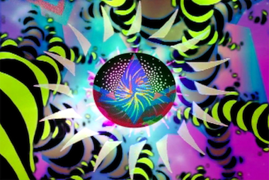 Shalo P presents two works, The Raven Suite and The Furnace (both 2010), which are projected pieces in the cut-up tradition, with accompanying found and recycled music. In the smaller of the two rooms, Raven begins with a black-and-white close-up of a sweat-soaked Jacques Brel crooning in French. Soon viewers find themselves in alternating sections of lyrical Beatles-esque music and sounds-to-suffer-in-hell-by, with appropriate, attendant images. The artist works the “figure/ground” tradition with central, usually rounded images, around which flow striped arms and other post-psychedelic imagery. Kaleidoscopic changes with precision editing follow with astronomical and meteorological themes. References to “Lucy in the Sky with Diamonds” and Flock of Seagulls appear and quickly fade. Dolphins dive. In a few highly effective moments, a small floor monitor comes alive to reiterate what is depicted on the large screen.