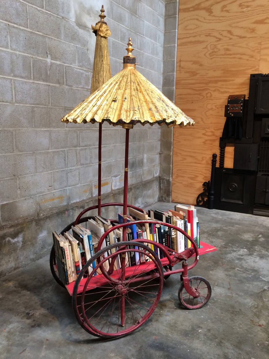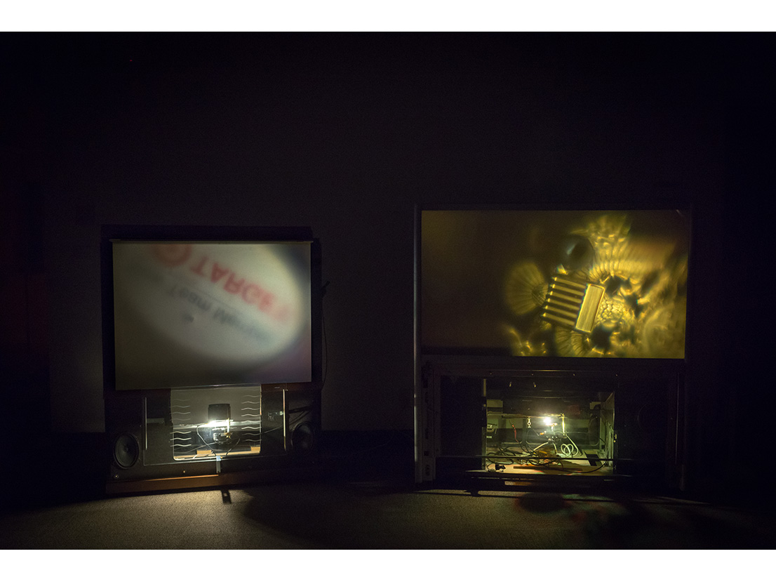 We Always Progress features the writer Ingrid Rojas Contreras, the artist’s wife and frequent collaborator, doubled and standing within a capsule. It is one of four three-minute videos projected onto two large screens positioned to form a corner. Although the capsule shares the retro-futurist look of many objects in the exhibition, Barber constructed it by removing the shelves from a display case for small objects, raising it onto wheels, and adding fluorescent lights. As in all the works on view, the materials are exclusively items thrown away by San Francisco residents. Contreras recites words from notes found by Barber that he at first thought were written by an analyst helping a client through a regression, but later discovered were jottings on Brian Weiss’s best-selling Many Lives, Many Masters. The two versions of Contreras speak about the imagined regression; one of her forms takes the role of the analyst and the other of client.