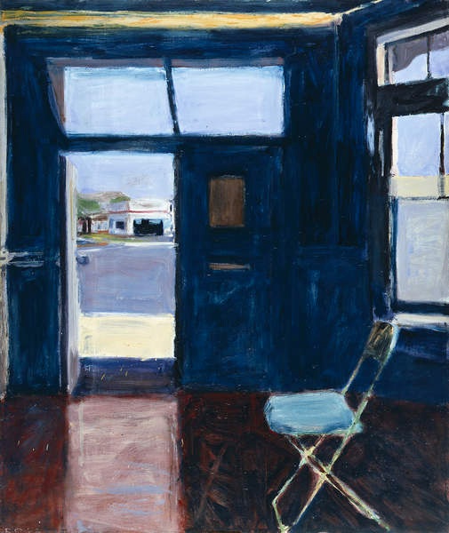 In his essay, Burgard notes Diebenkorn’s approach to painting “as a contingent process,” and one can readily discern through the pentimenti—the visible layers of earlier marks—how he built and reworked his compositions.2 These traces function as course corrections throughout what are largely fabricated vistas, conjured by Diebenkorn gazing at his canvas rather than the landscape beyond it. One also frequently sees an expanse framed more concretely—by a deck, a porch, or an open doorway—so that the view is of looking out onto the world but not quite stepping into it. Diebenkorn’s sense of place might have been mediated by the light and terrain of the Berkeley hills but it ultimately resides in the pull of paint to canvas.
